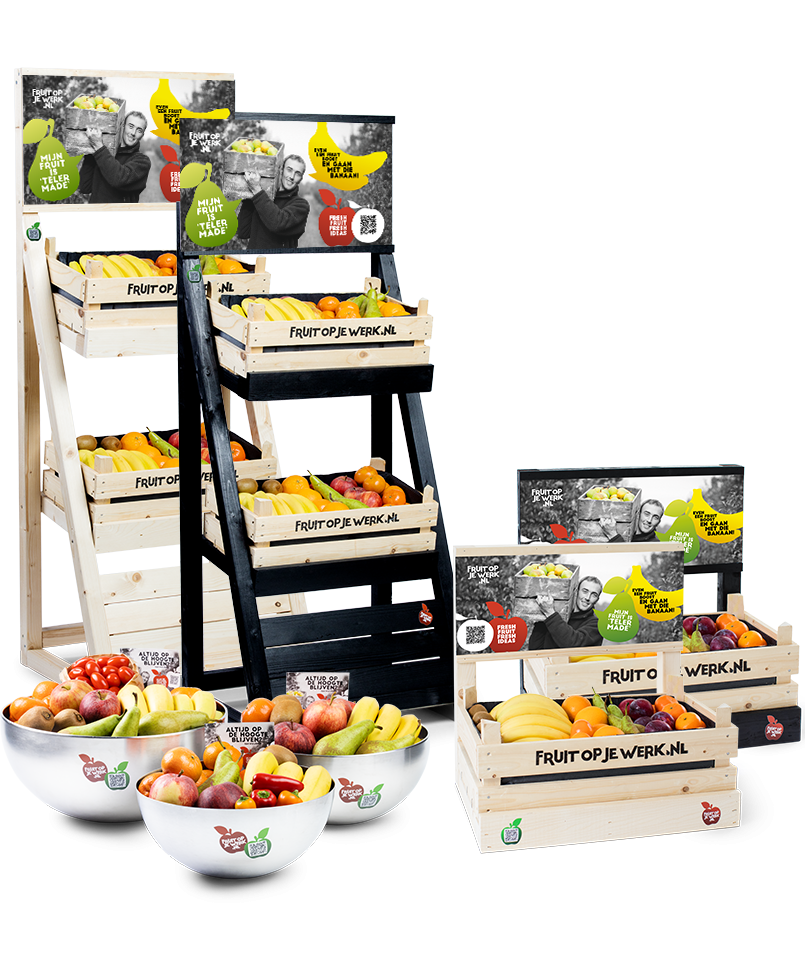 Nous réfléchissons ensemble à l'endroit le plus approprié pour placer les fruits et nous déterminons si vous optez pour nos boîtes de fruits ou si vous préférez les corbeilles en inox. Si vous le souhaitez, nous pouvons réaliser la communication sur les fruits entièrement dans le style de votre organisation. Donnez un coup de pouce supplémentaire à l'introduction des fruits frais sur le lieu de travail grâce à une campagne de lancement marquante.