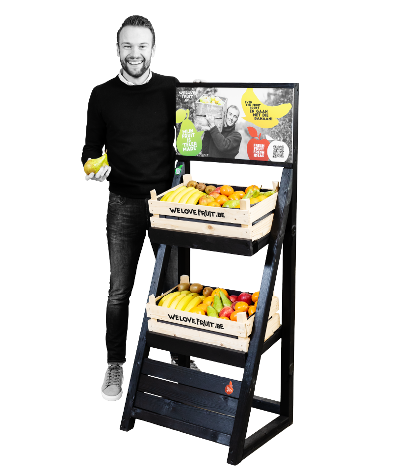 Offrir des fruits frais ne suffit pas toujours à modifier structurellement le comportement des gens. C'est pourquoi notre concept est plus complet et se concentre sur l'expérience et la sensibilisation à une alimentation saine. Nous attirons l'attention sur les fruits avec nos cartes et nos présentoirs. D'une manière légère et accessible, nous partageons des informations sur les propriétés et les avantages des fruits. Parfois avec un clin d'œil, mais toujours avec l'intention de donner aux gens un aperçu de leur mode de vie.